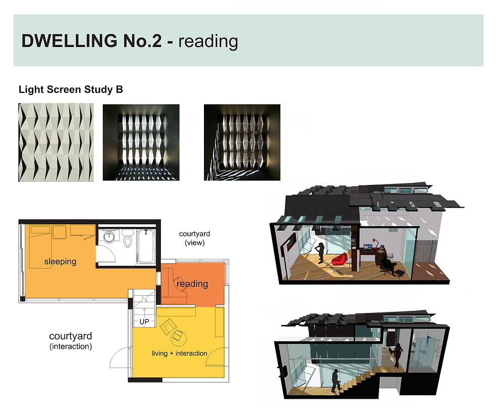 Creative natural lighting was to serve the Lightworks was the main goal for this project, creating a light screen and studying the natural light and shade was a main focus in this projects. prior do designing the dwellings, intensive light studies took place.